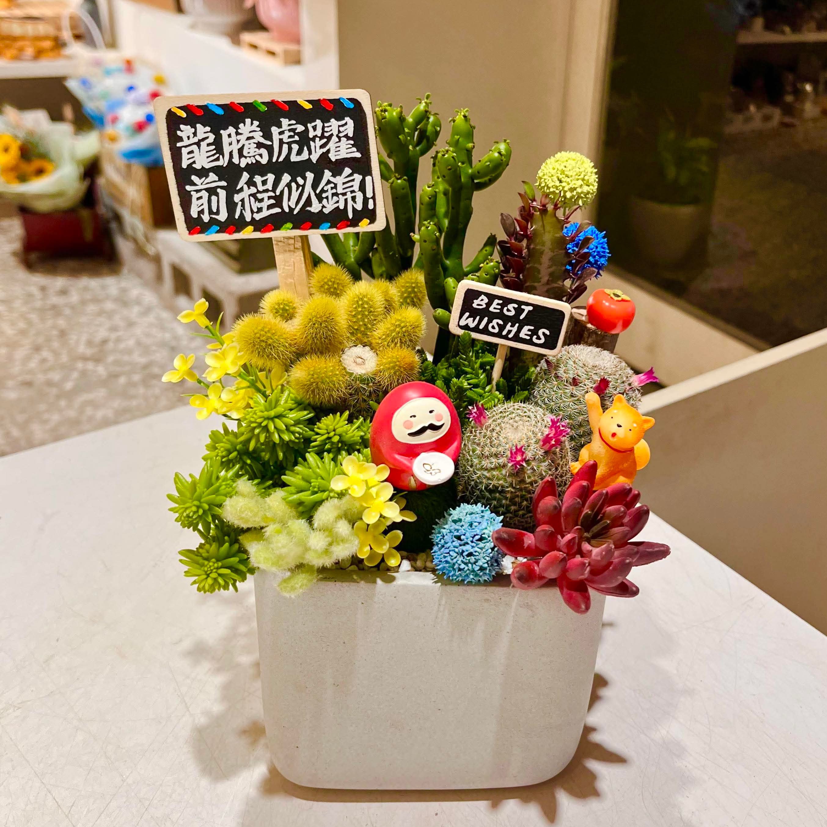 ► 植物會使用多肉、仙人掌和少許仿真花(仿真花約佔5-10%),也可選擇使用發財樹當主植物。若有特殊要求可在Line告知。