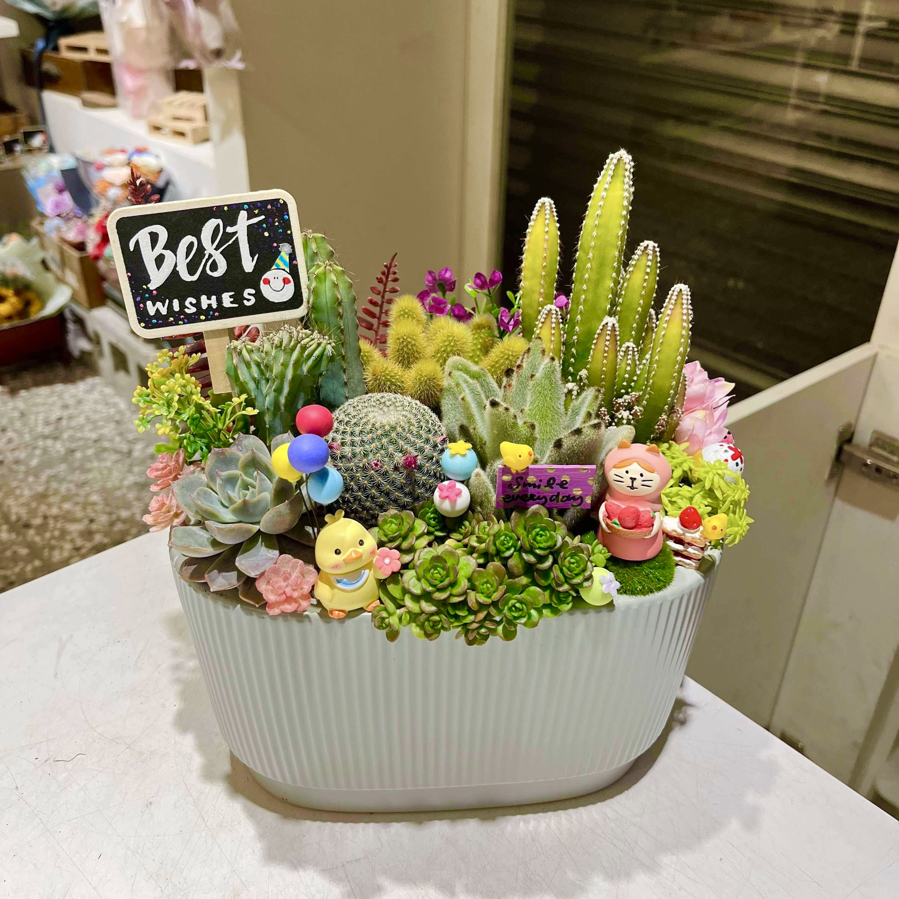 ► 植物會使用多肉、仙人掌和少許仿真花(仿真花約佔5-10%),也可選擇使用發財樹當主植物。若有特殊要求可在Line告知。