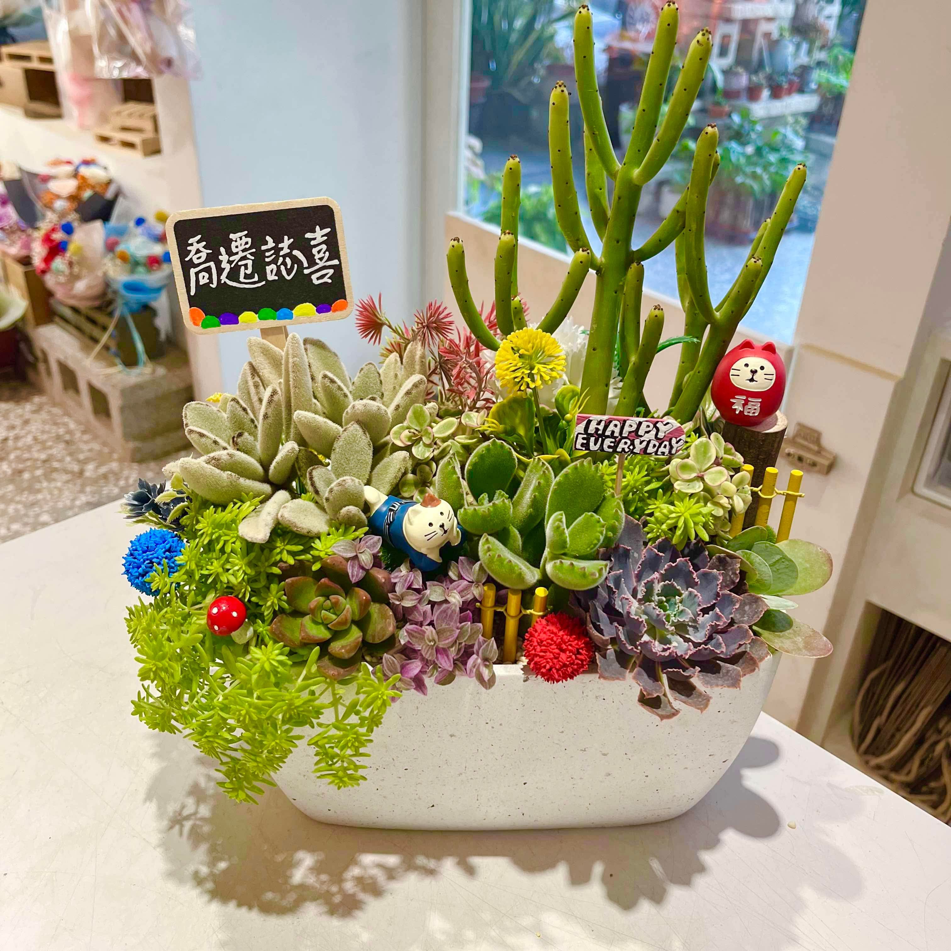 ► 植物會使用多肉、仙人掌和少許仿真花(仿真花約佔5-10%),也可選擇使用發財樹當主植物。若有特殊要求可在Line告知。