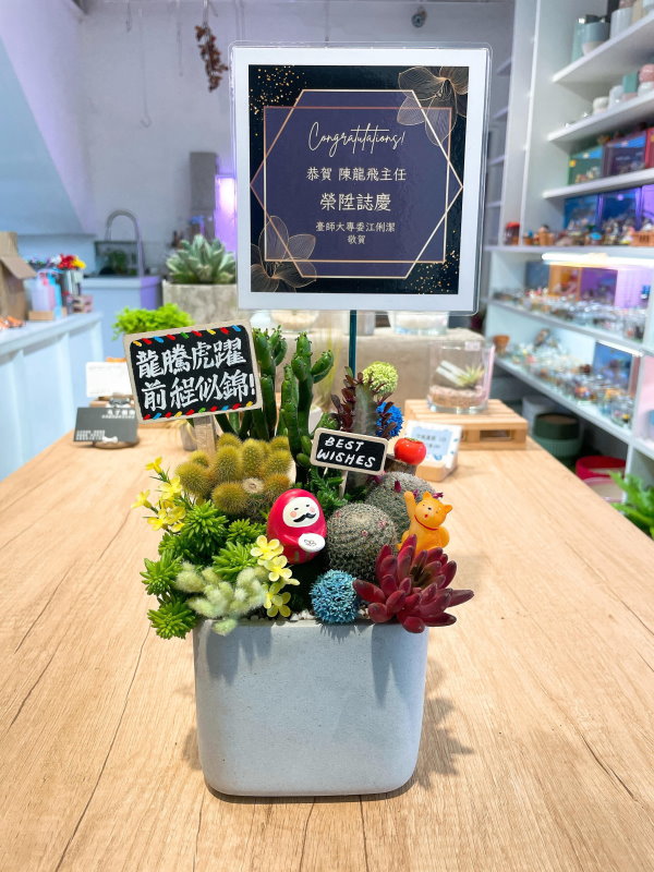 ► 植物會使用多肉、仙人掌和少許仿真花(仿真花約佔5-10%),也可選擇使用發財樹當主植物。若有特殊要求可在Line告知。
